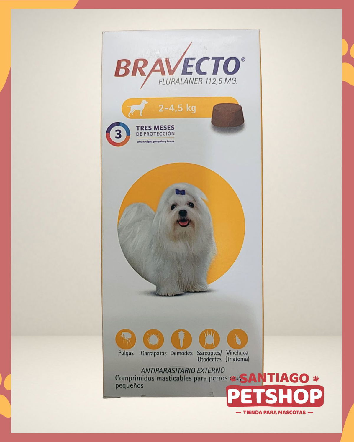 Descubre la protección de BRAVECTO®, el comprimido masticable para perros que actúa contra pulgas, garrapatas y sarnas durante 12 semanas Puede aplicarse como parte del tratamiento para el control de la Dermatitis Alérgica por Picaduras de Pulgas (DAPP). Además, reduce la transmisión de enfermedades transmitidas por garrapatas, como Babesia canis. Se puede administrar en cachorros desde las 8 semanas de edad e incluso en perras preñadas y en lactancia. Brinda una protección duradera y efectiva para el bienestar de tu mascota.