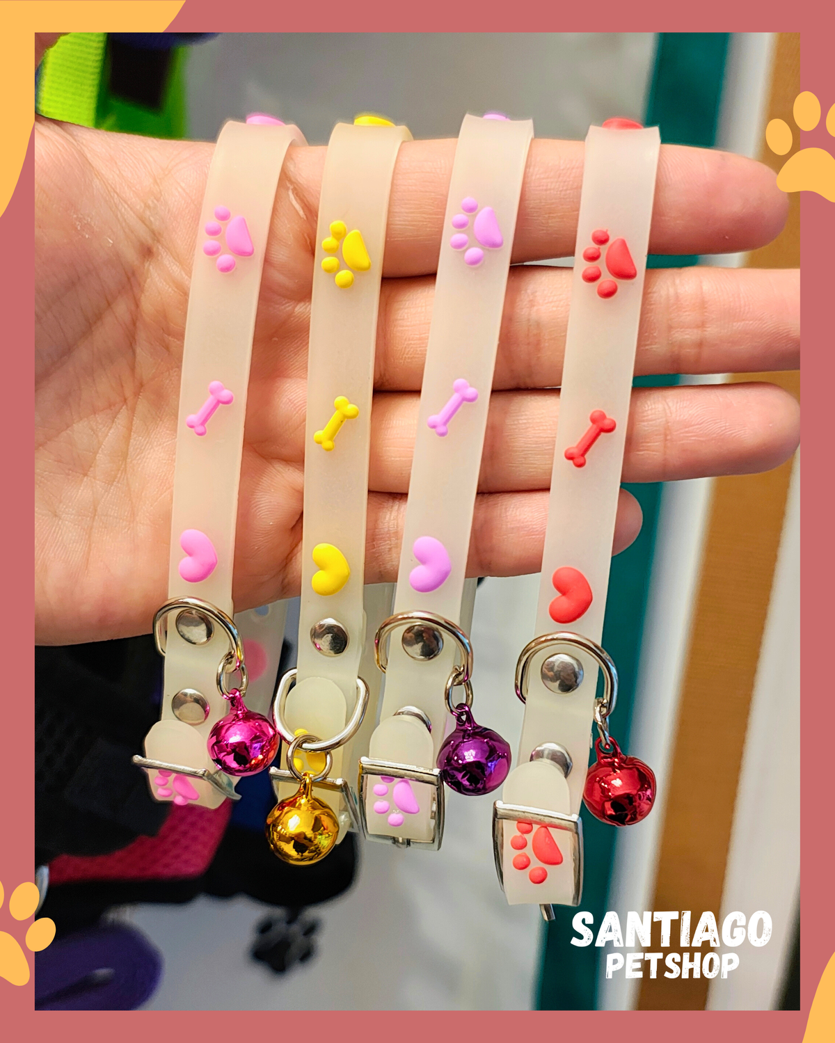 Collar de goma luminoso en la oscuridad con detalles de huesos, corazones y huellitas