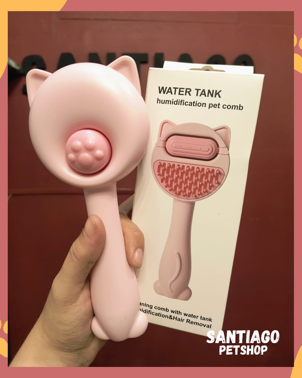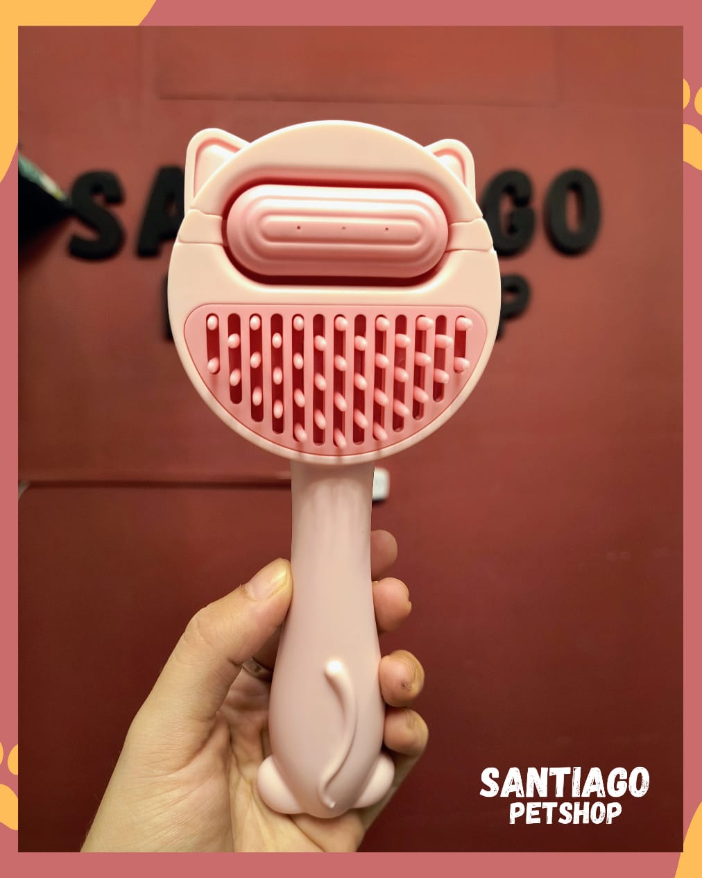 Peine humidificador con diseño de gatito que hidrata suavemente el pelaje e incluye un botón expulsor que retira fácilmente el pelo acumulado del cepillo.