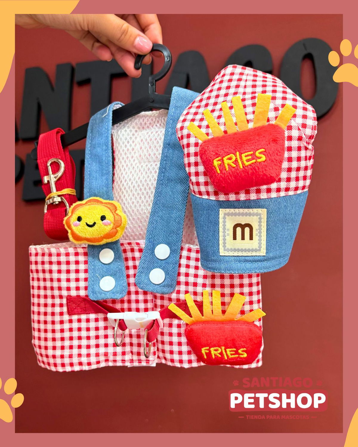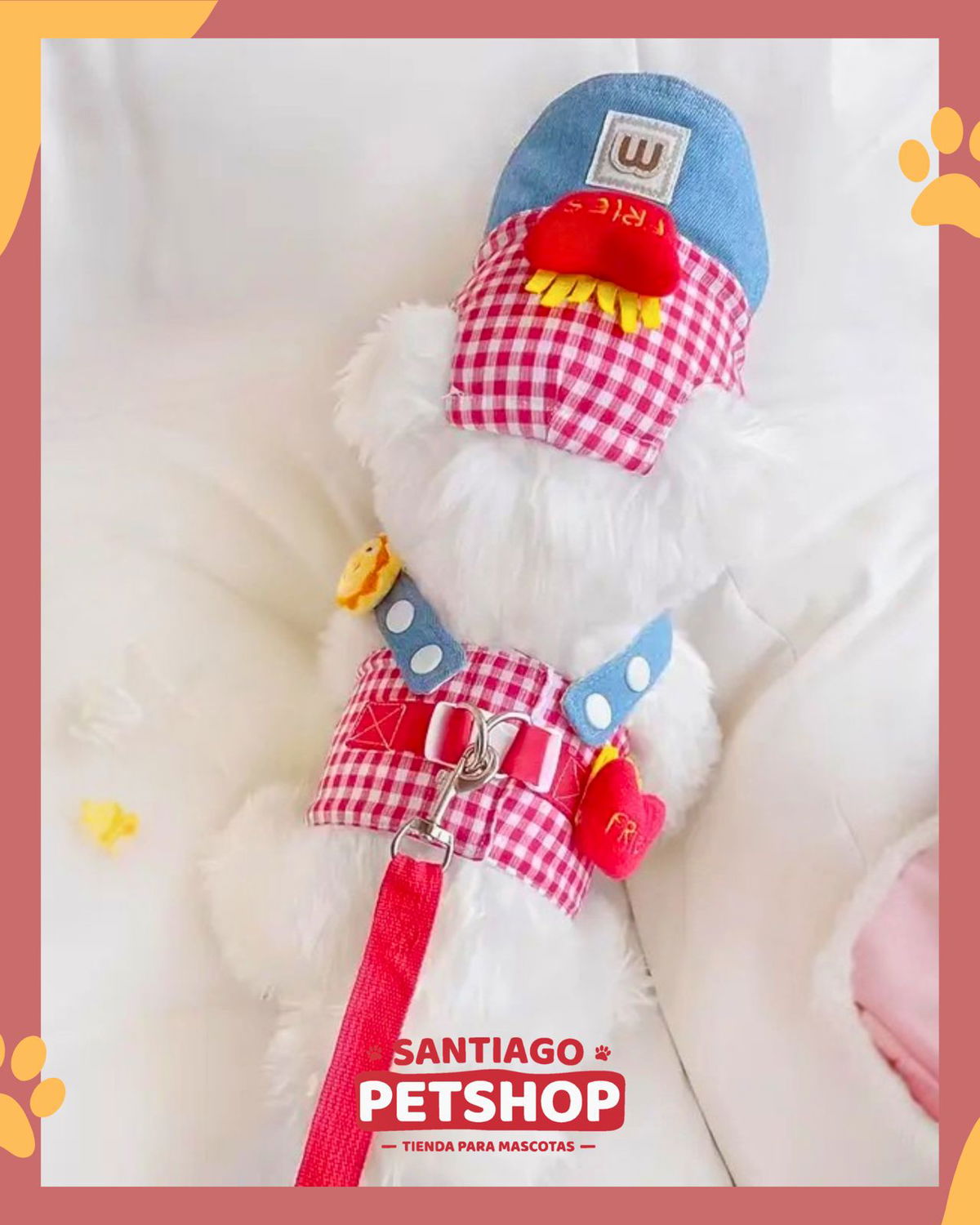 Dale a tu mascota un look único con este conjunto completo que incluye pecherita, gorrita y correa, todo en el mismo diseño. Ideal para paseos, salidas o para que luzca a la moda en cualquier ocasión.