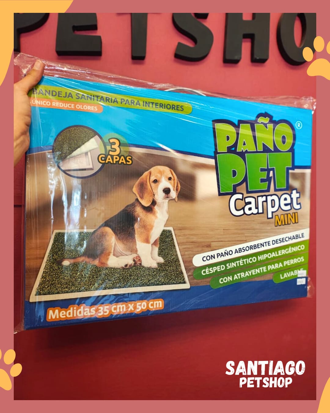 Forma de uso: Apoya la bandeja en el lugar asignado como área sanitaria del perro, colocas sobre la bandeja el paño absorbente y luego coloca el césped sintético. Cambia los paños desechables cada algunos dias.