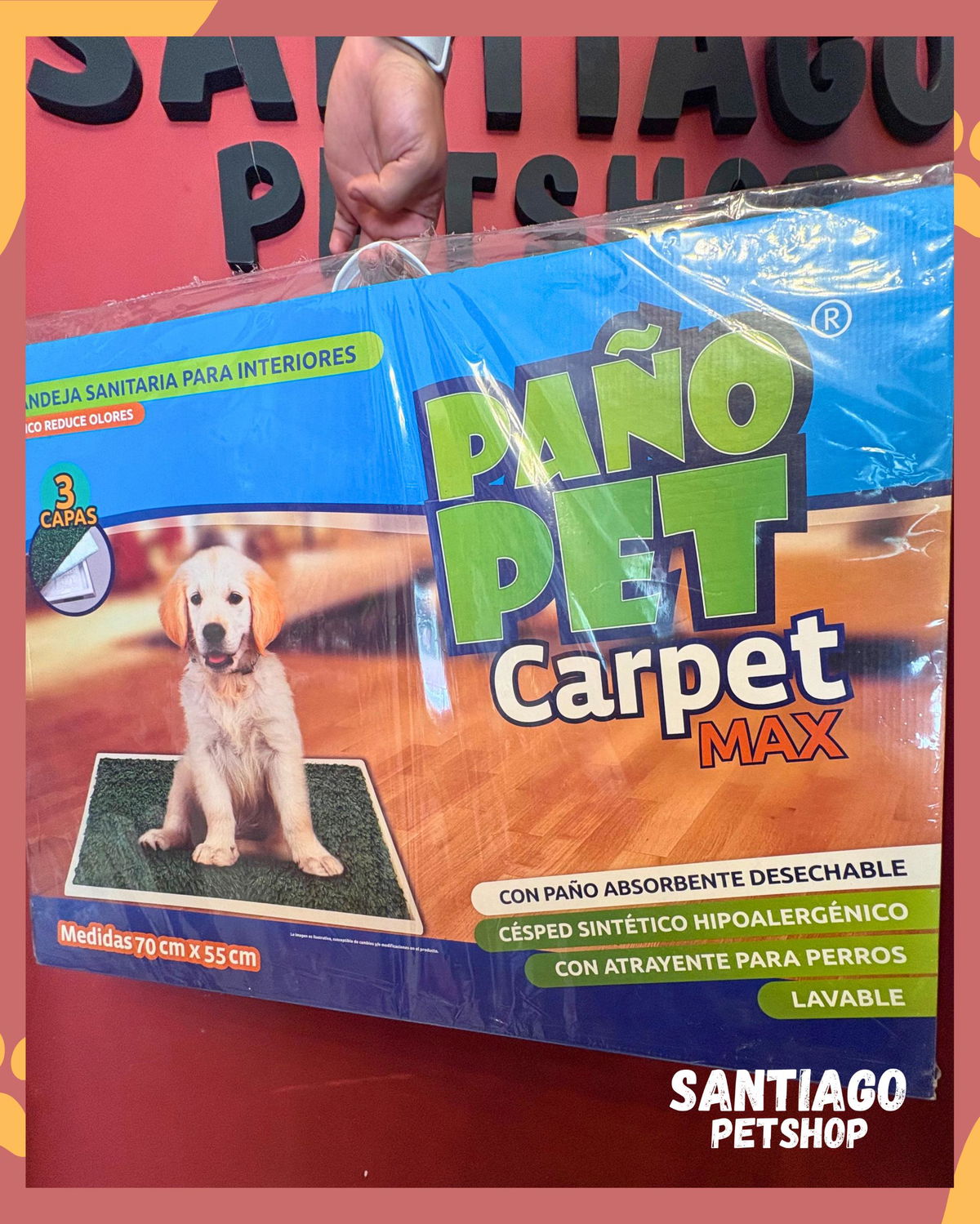 Forma de uso: Apoya la bandeja en el lugar asignado como área sanitaria del perro, colocas sobre la bandeja el paño absorbente y luego coloca el césped sintético. Cambia los paños desechables cada algunos dias.